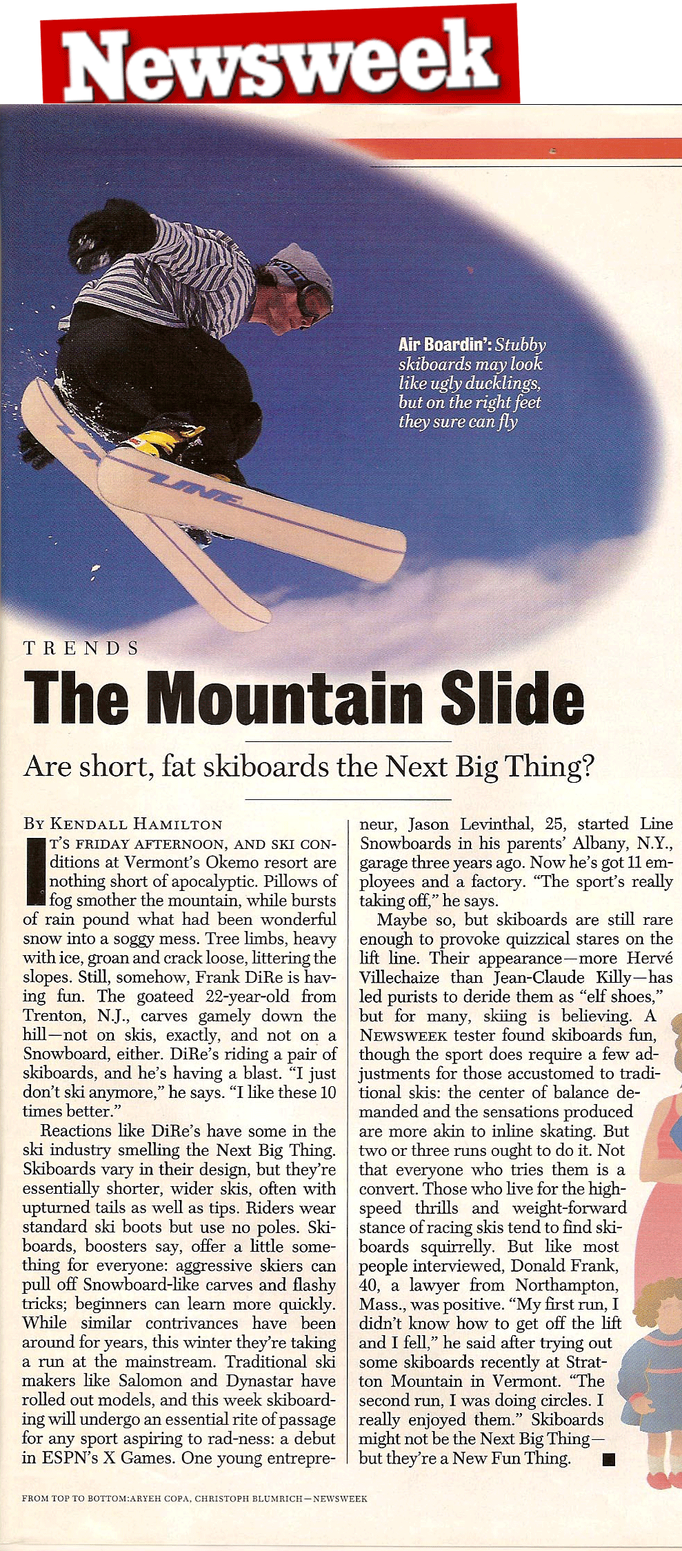 It’s hard to believe now, that in the late 90’s skiing was so stale, that even a mainstream magazine like Newsweek felt the need to cover this story. A start-up ski company rejuvenates the sport of skiing with new twin tip skis. Double click to enlarge image & read